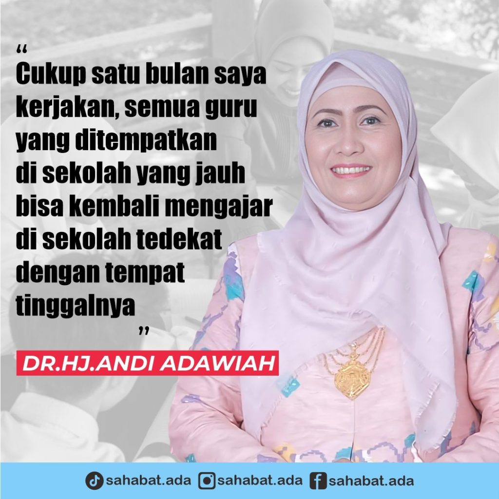 Andi Adawiah menegaskan, Tidak butuh waktu lama, cukup satu bulan saya kerjakan, semua guru yang mengajar di sekolah yang jauh bisa mengajar di sekolah tedekat dengan tempat tinggalnya” tutup Dr.Andi Adawiah saat ditanya jangka waktu yang dibutuhkan untuk merampungkan hal tersebut.