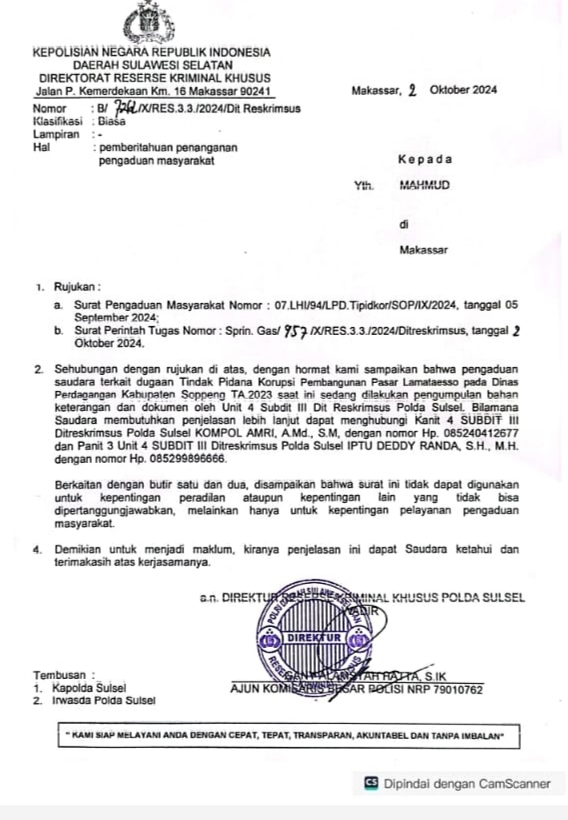 Targettuntas com -Makassar – Direktorat Reserse Kriminal Khusus (Ditreskrimsus) Polda Sulawesi Selatan proses laporan dugaan tindak pidana korupsi terkait pembangunan Pasar Lamattaesso di Kabupaten Soppeng.