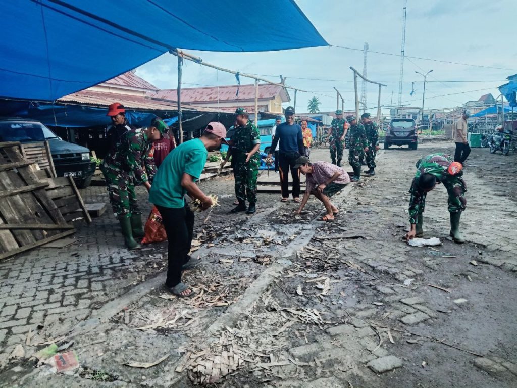 Personil Koramil 1423-05/Marioriwawo Kerja Bakti bersama warga Membersihkan Pasar